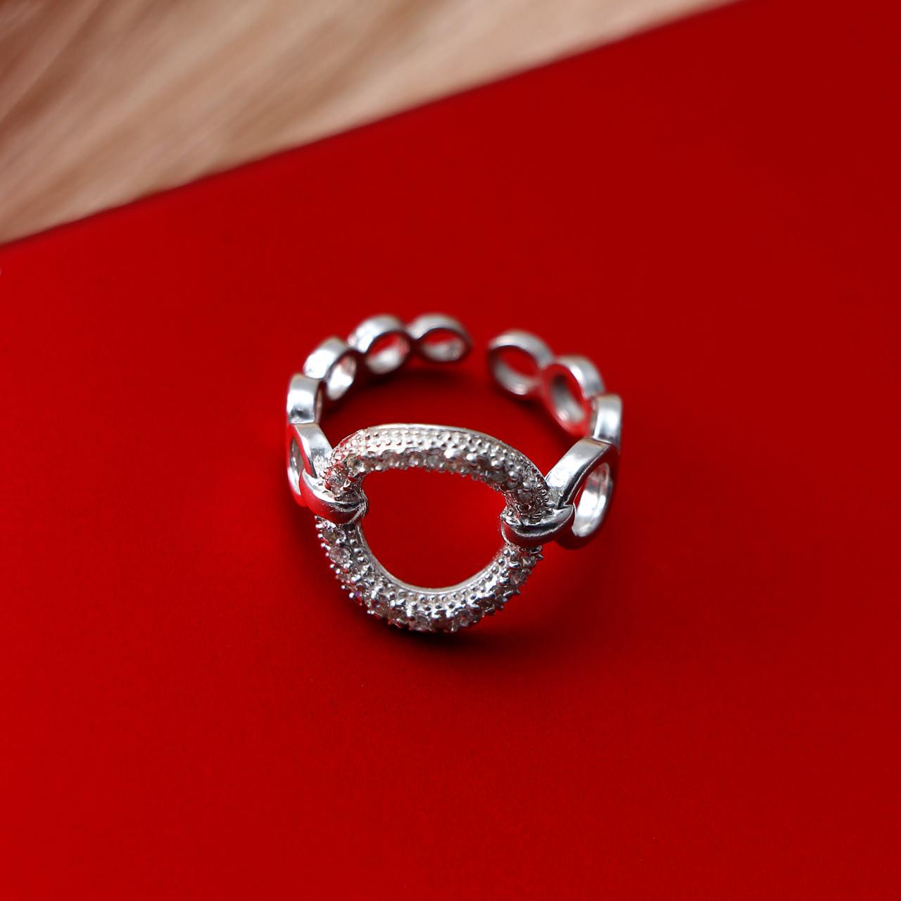 Un motif circulaire serti de zircons capte la lumière, tandis que les cercles ajourés qui l’entourent apportent légèreté et modernité. Cette bague en argent 925 incarne la continuité, la fluidité et la beauté du mouvement.